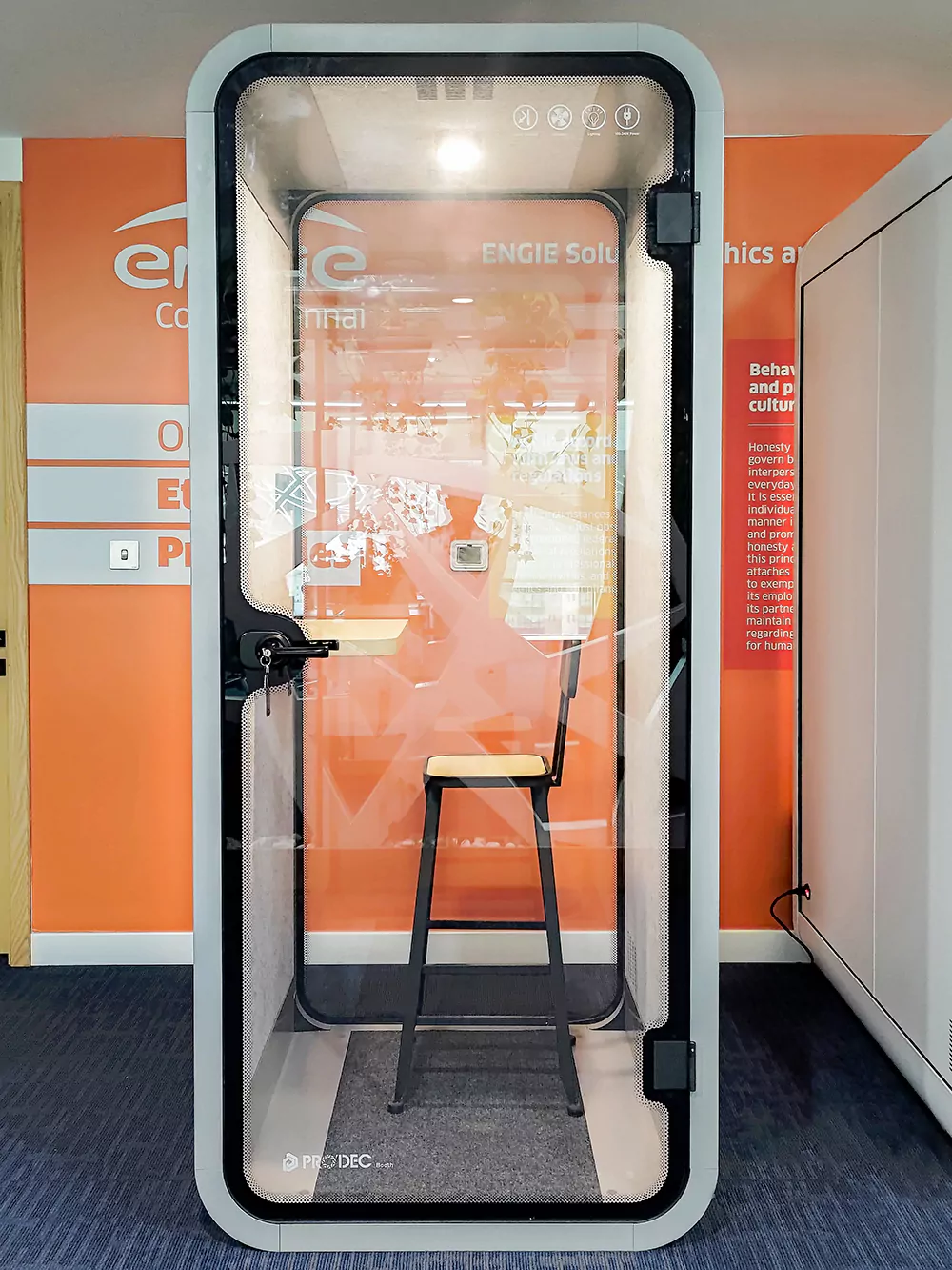 Equipped with 4000K daylight color temperature LED lighting system150LX), it would satisfy the needs of normal activities. In the event of additional power requirements, a backup power supply is readily installed inside the booth.